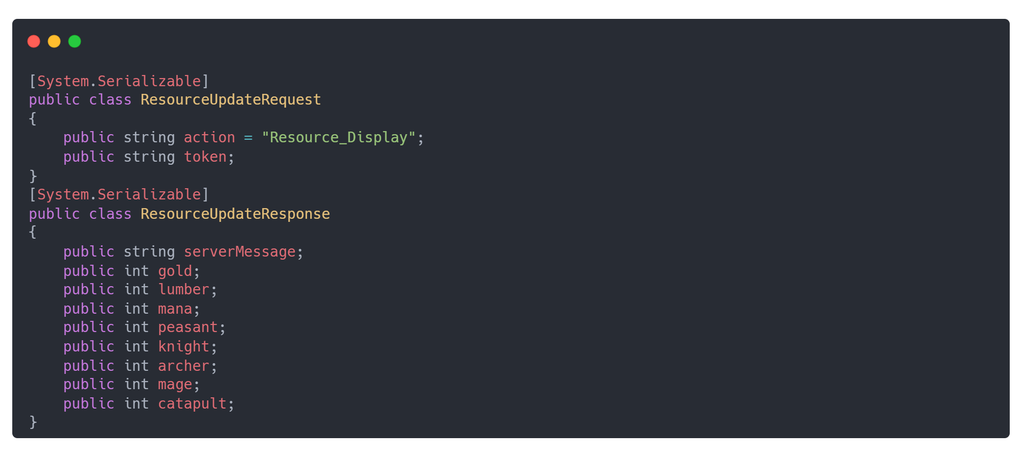 Resource Attributes: Includes integer attributes (gold, lumber, mana, peasant, knight, archer, mage, catapult) representing the updated quantities of various in-game resources.
